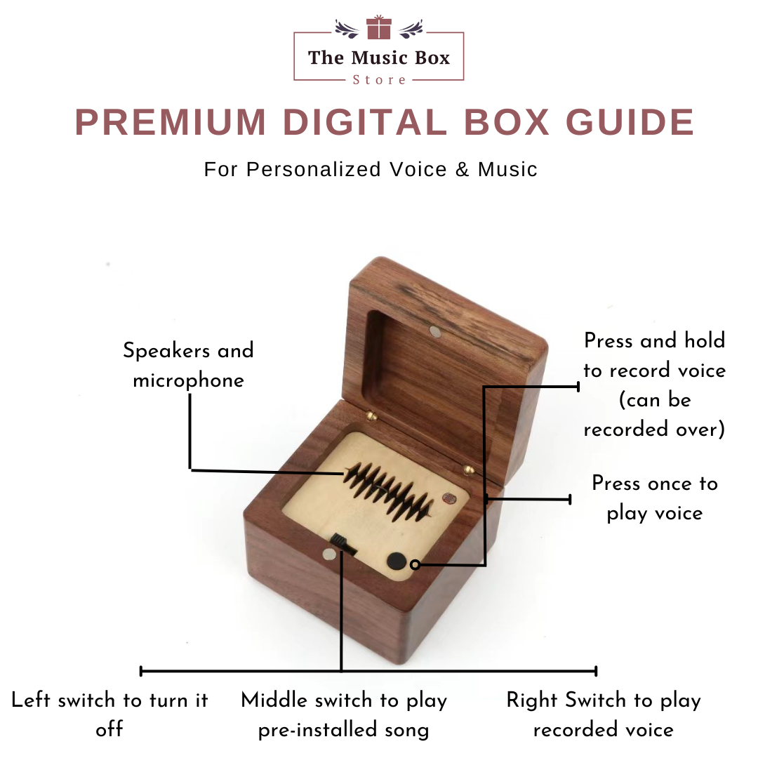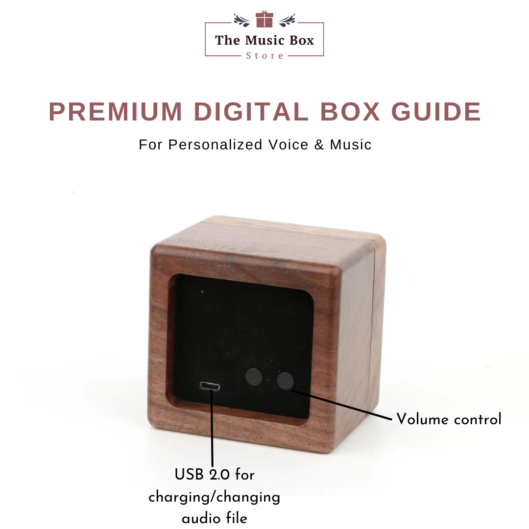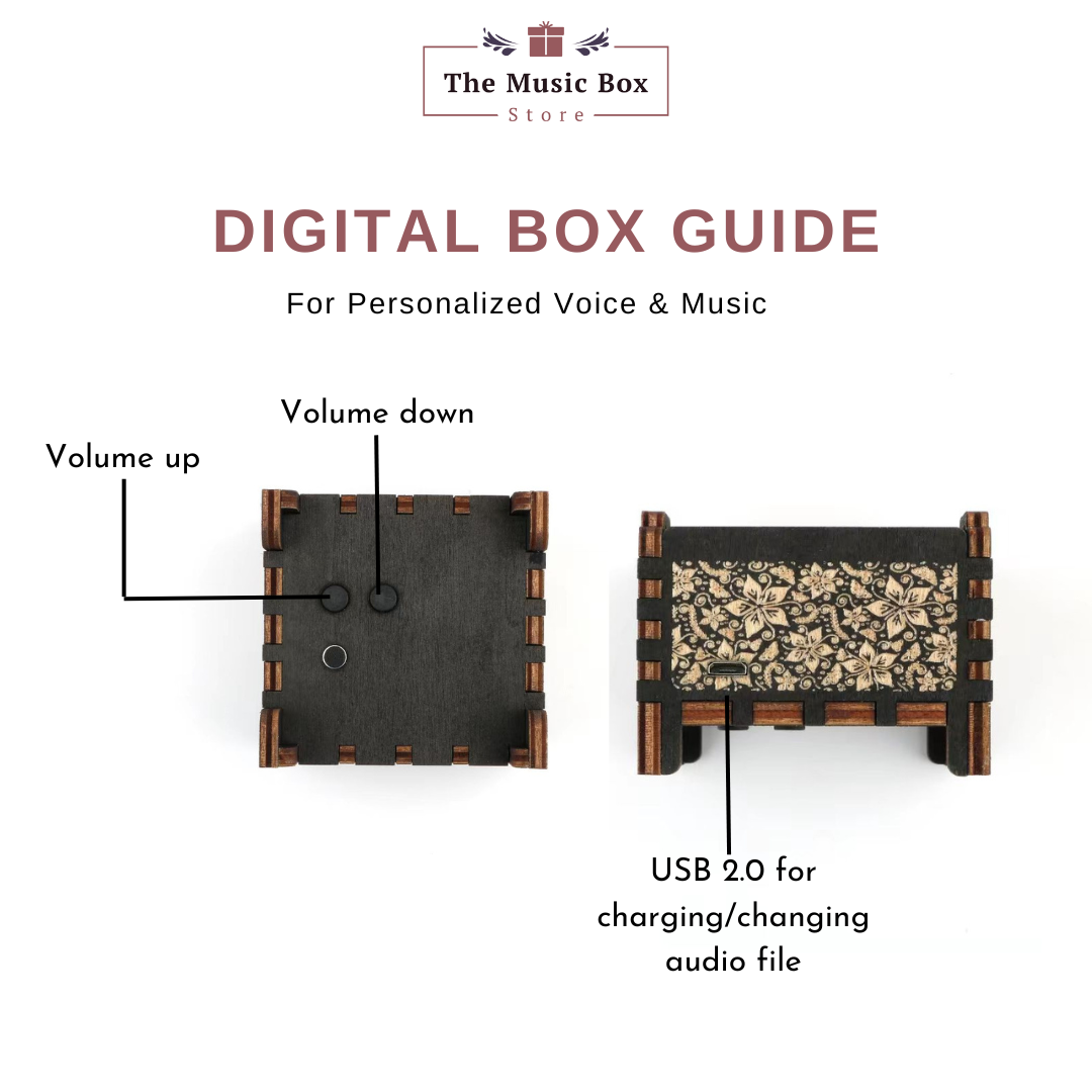 Create a one-of-a-kind keepsake with our Digital Music Box, designed to play any audio file, from cherished voice recordings to hard-to-find tunes. Fusing exquisite wooden artistry with technology, this music box is a heartfelt and unforgettable gift for your loved ones.